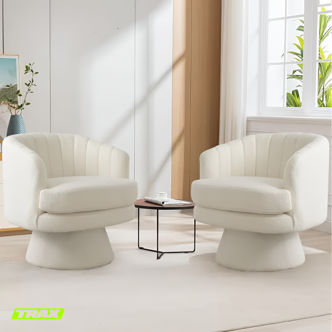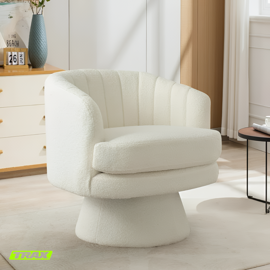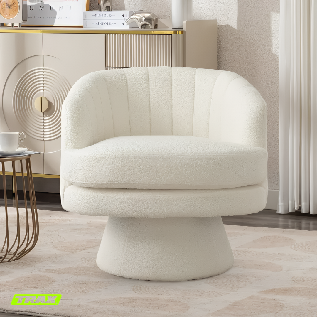 I absolutely love the TRAX Bloom chairs! They instantly elevated my lounge area with their soft, luxurious lambswool texture and modern rounded design. The 360° swivel is super smooth and convenient, letting me turn easily without getting up. They’re incredibly comfortable — perfect for relaxing with coffee or reading by the window. The quality feels premium, and the neutral beige tone blends beautifully with any décor. Truly worth every penny!