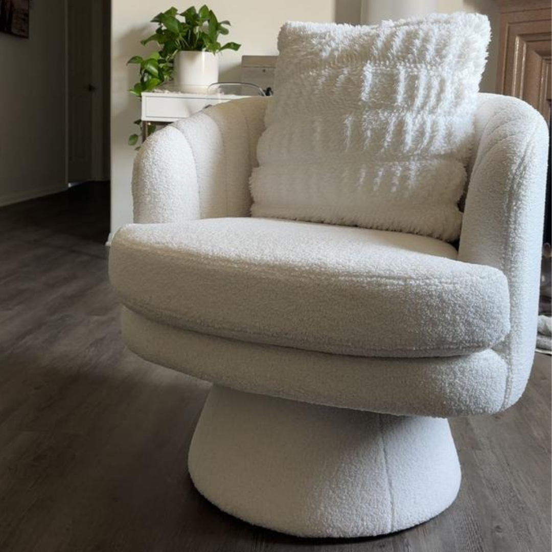 The TRAX Bloom is easily the comfiest chair I’ve ever owned! Its plush lambswool texture feels luxurious and warm, perfect for curling up with a book or morning coffee. The swivel motion is smooth and quiet, letting me turn effortlessly without moving the base. It adds a modern, elegant touch to my space while keeping it cozy and inviting. I’ve received so many compliments — it truly transforms the room into a little comfort haven!
