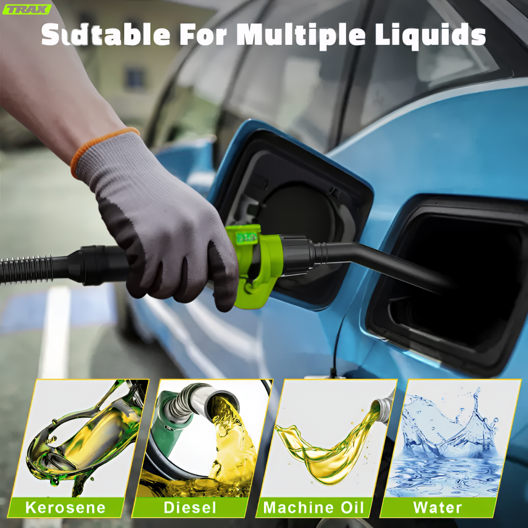 The TRAX PowerPump™ is highly versatile, compatible with gasoline, diesel, oil, and even water. With its included 51'' hose and 3 adapter options, it works seamlessly with different containers for both home and professional use.