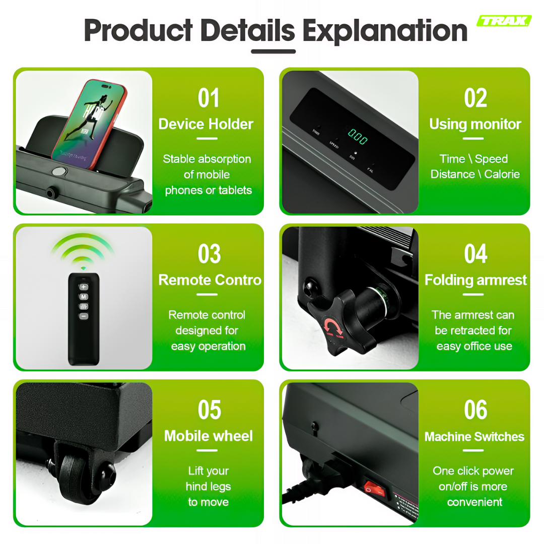The TRAX PowerWalk™ is perfect for home, office, and small gym environments. It’s ideal for users who want to stay active during work hours or enjoy light-to-moderate cardio in limited spaces.