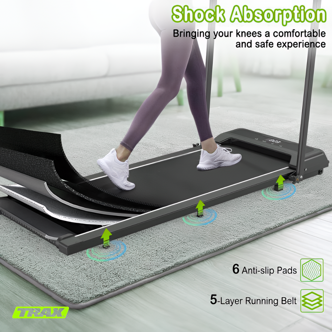 I’m so happy with my TRAX PowerWalk! It fits perfectly beside my bed, so I can walk or jog while watching TV or listening to music. The display is bright and easy to read, and the whole setup feels sleek and modern. It runs quietly, which makes it ideal for apartment living. I also love how easy it is to fold and move when I need extra space. The build quality is solid, and the handle gives extra balance when walking faster. Definitely one of my best home fitness purchases this year!