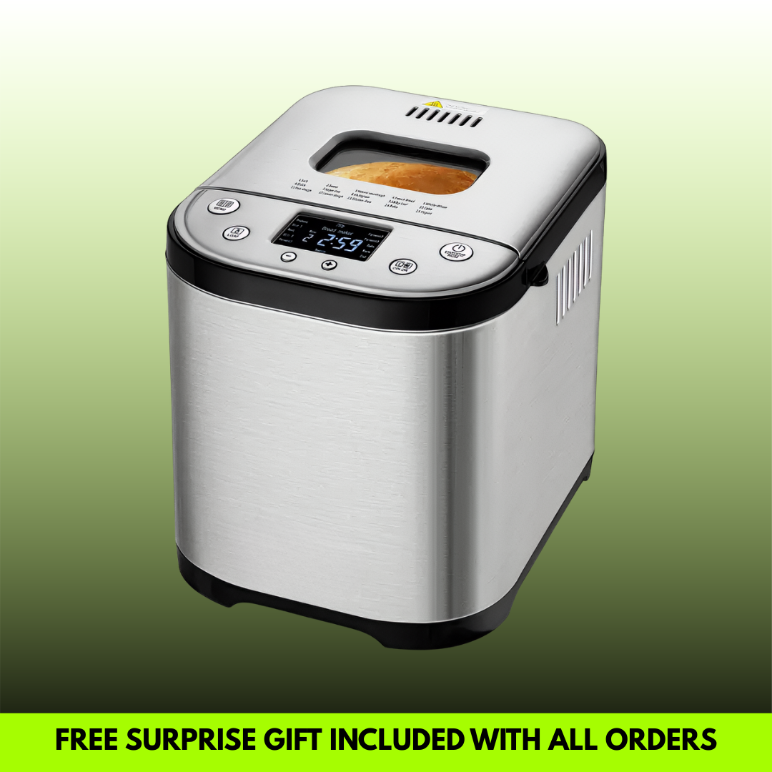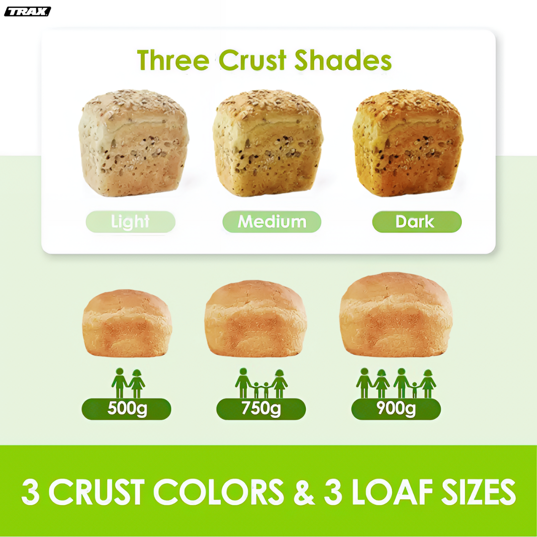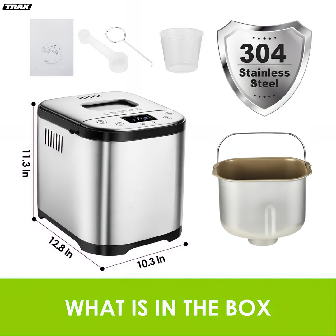 The TRAX SmartBake Pro™ bakes up to a full 2LB loaf, with options for smaller sizes. Its compact, stainless steel design fits neatly on countertops while offering ample capacity for everyday baking.